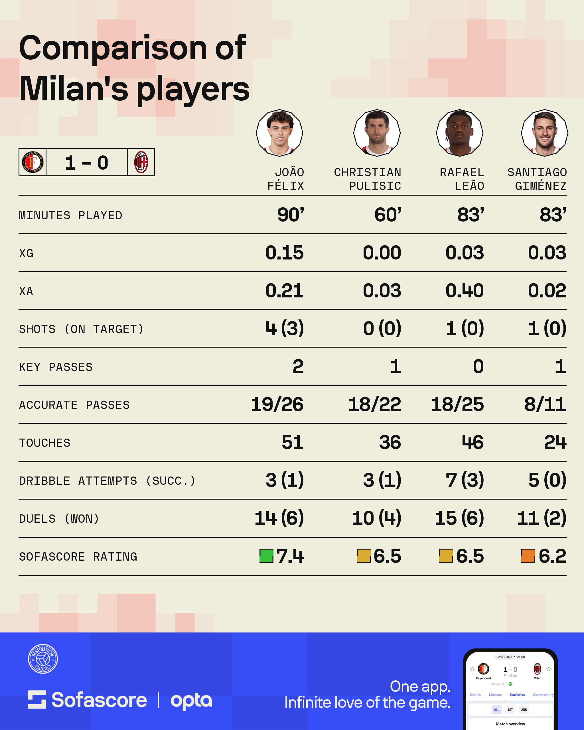 Numbers seldom paint the whole tale, but Leao’s risible xG of 0.03 – the same as Gimenez – coupled with a grand total of zero key passes completed speaks volumes for his contribution.