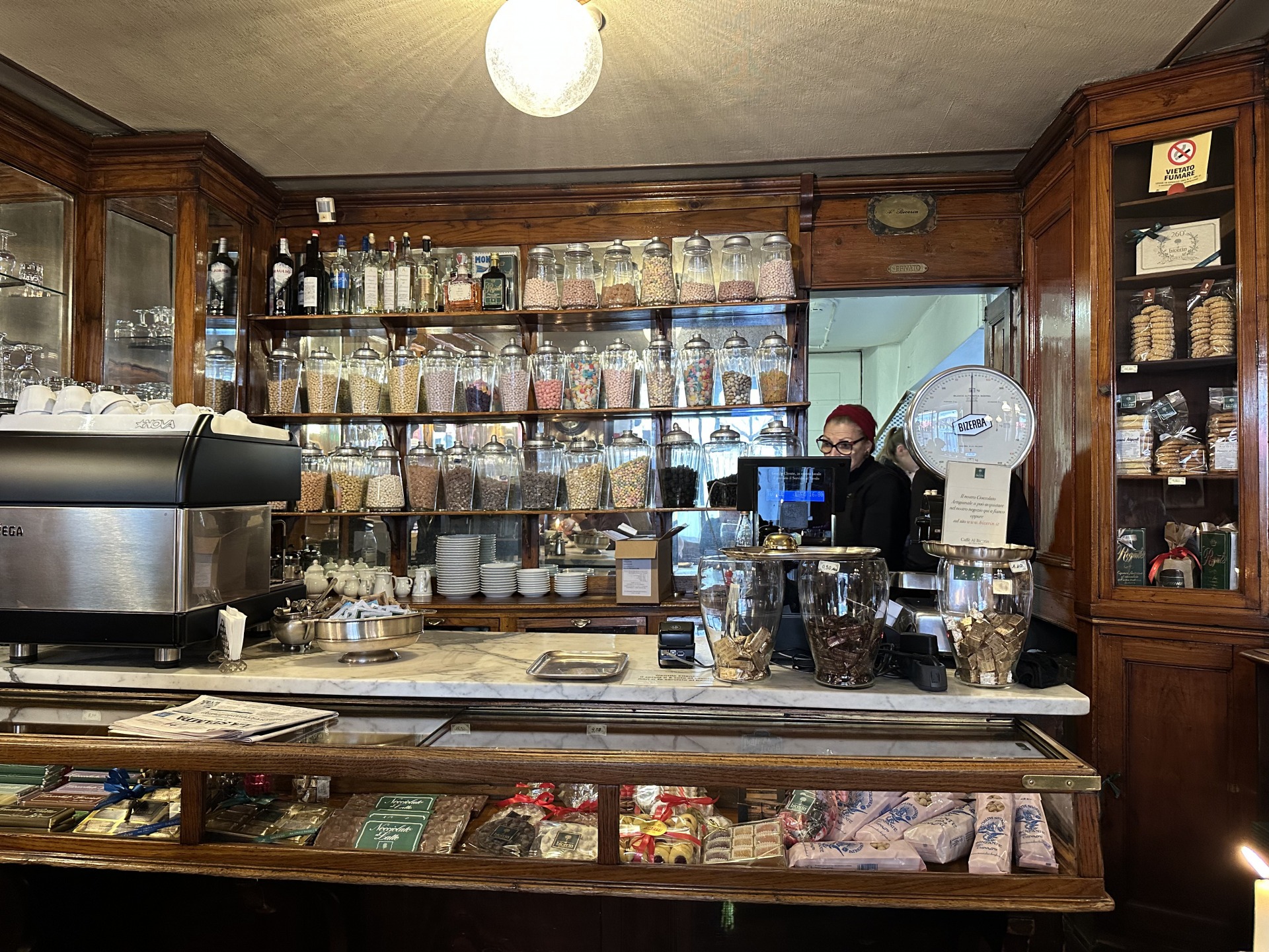 Walk into Caffe’ Al Bicerin and you will be welcomed by wooden panels on the walls, round white marble tables, the wooden and marble counter and the shelves for the iconic confetti jars, a legacy of when the cafe used to operate as confectionery shop in the 19th century.